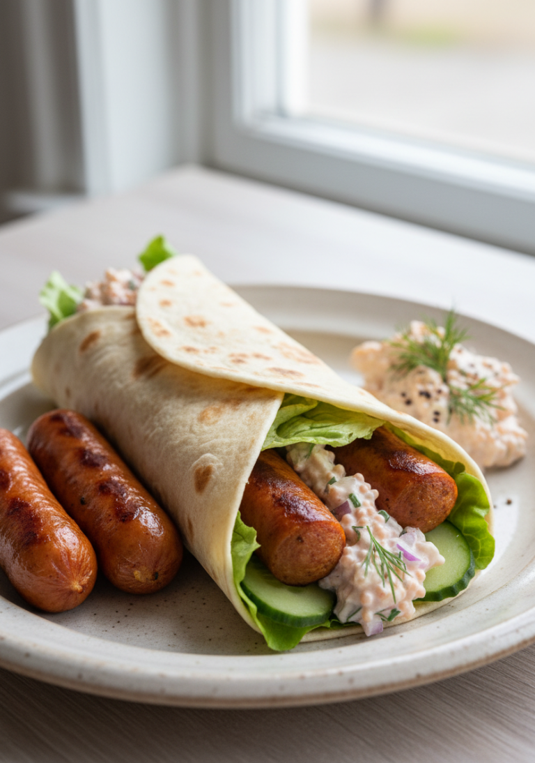 Tunnbröd → sallad → tomat → mos → körv → röran → rostad lök → rulla ihop → njut.
